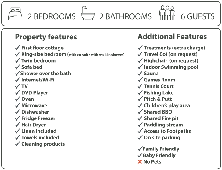 Kingfisher Cottage is a charming first-floor lakeside retreat with stunning views, accessed via a single flight of outdoor stairs. Perfect for families or groups of up to six, it features a spacious king-size bedroom with an en-suite bathroom & walk-in shower, and a second bedroom with twin beds. For additional guests, a double sofa bed in the living room provides extra space.