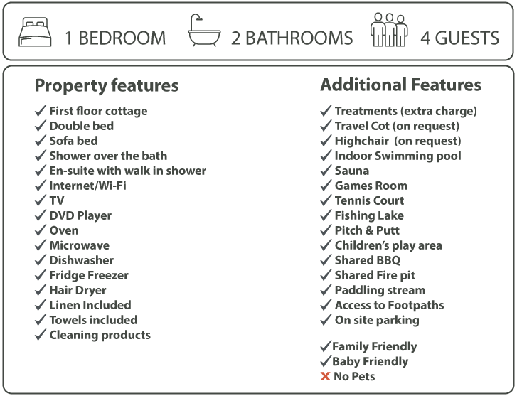 Located on the first floor & accessed via a single flight of outdoor stairs it features a double bedroom with an en-suite walk-in shower for privacy and comfort. The spacious lounge includes a double sofa bed for extra guests.